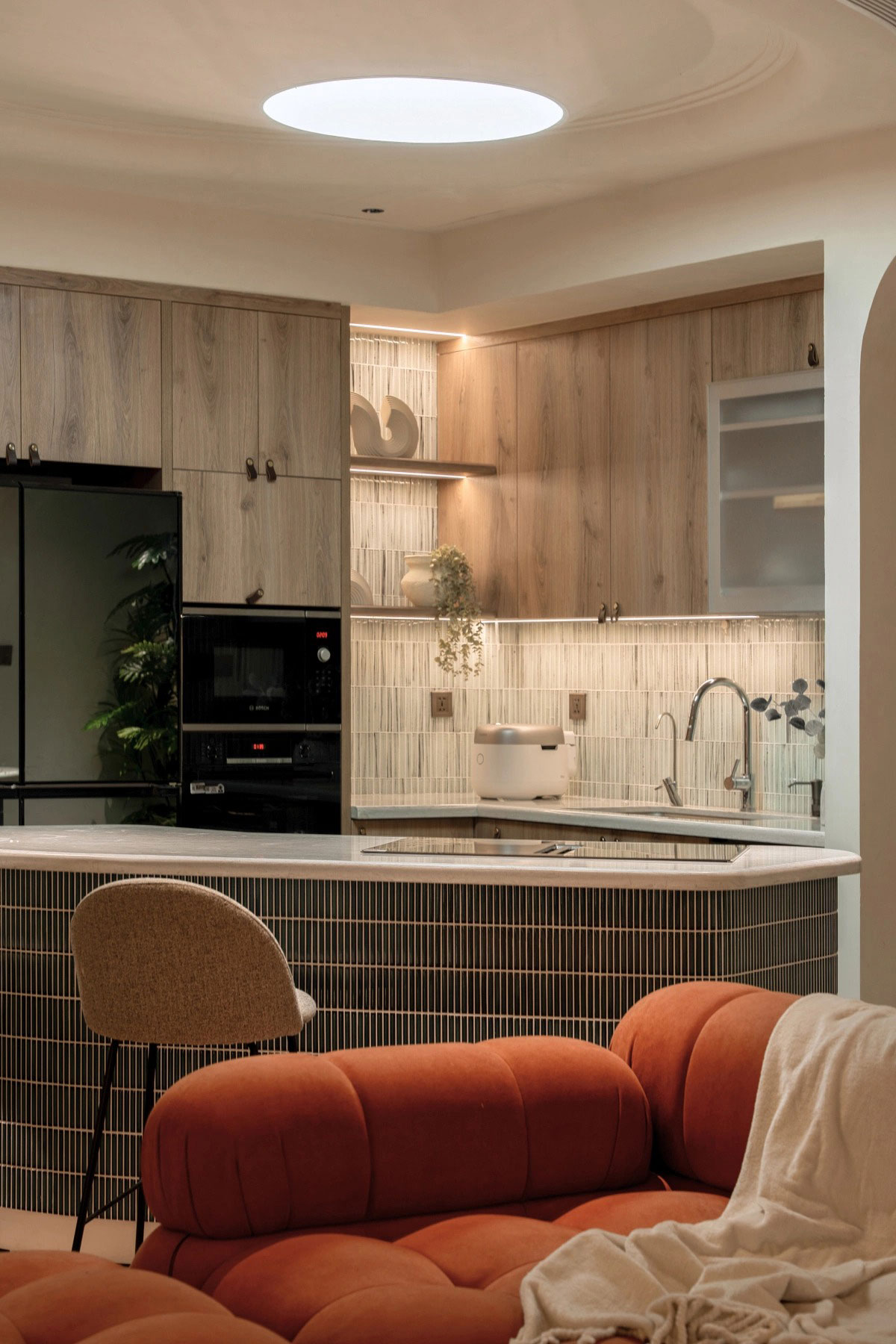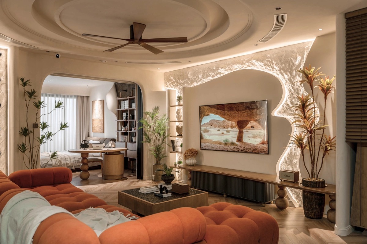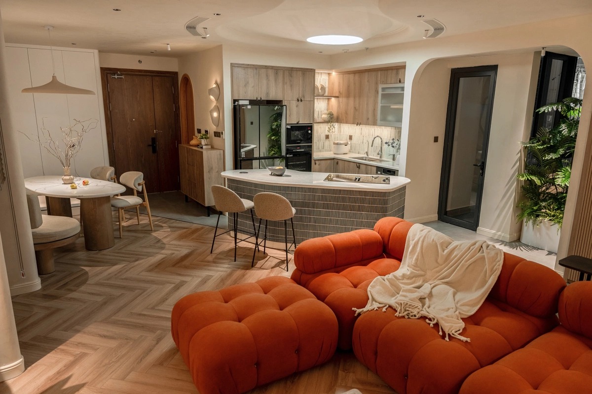 KTS lựa chọn phong cách wabisabi nhằm tăng cảm giác thô mộc, kết hợp cảm hứng nhiệt đới (tropical), tận dụng tối đa các đường tròn vào mảng miếng trang trí và đồ nội thất. Căn hộ được tạo thành bởi chuỗi các không gian phong phú chuyển tiếp và toát lên sự tự nhiên.