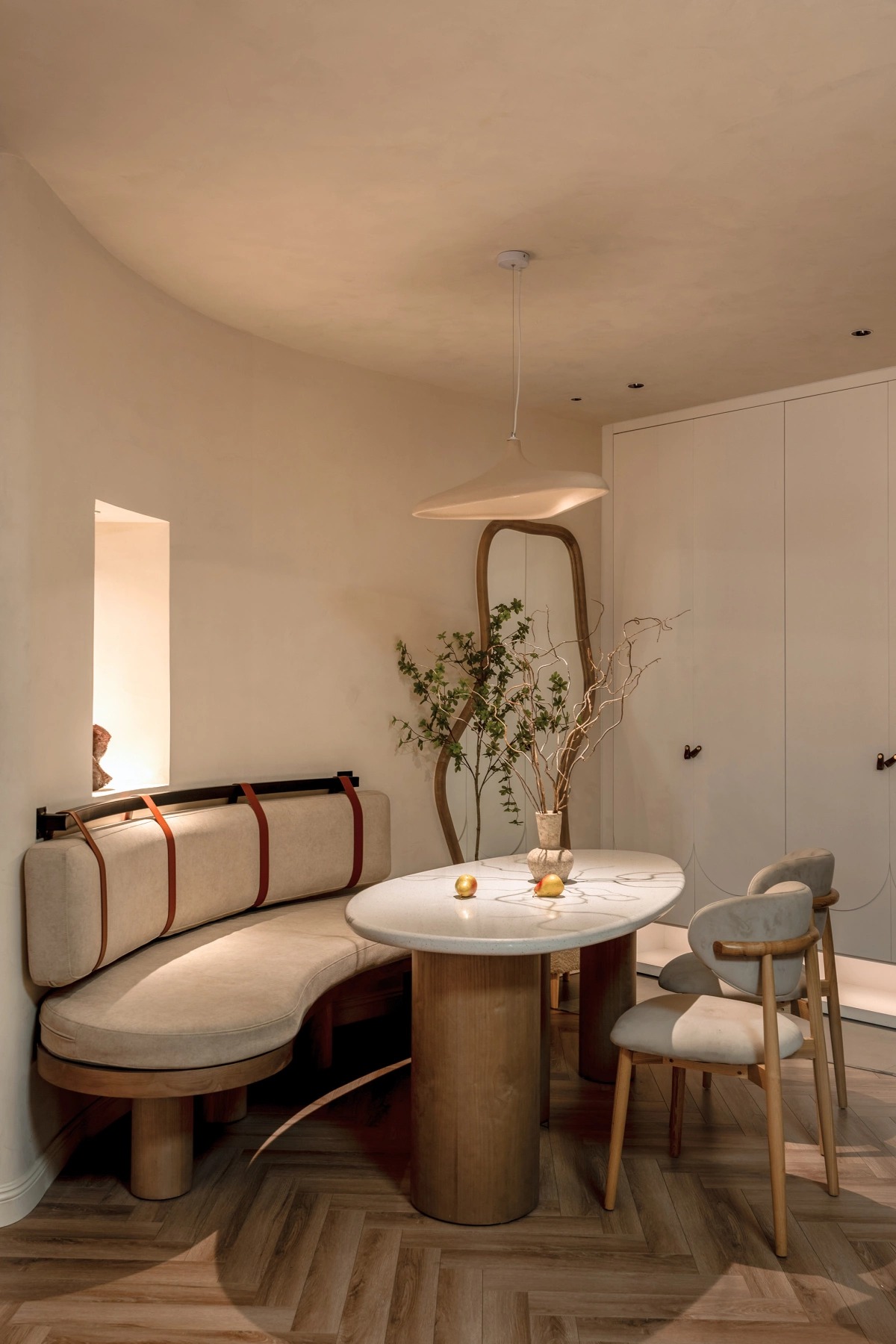 Bàn ghế ăn với thiết kế phần chân hình tròn, hài hòa với các mảng miếng mềm mại trên tường và nội thất.
